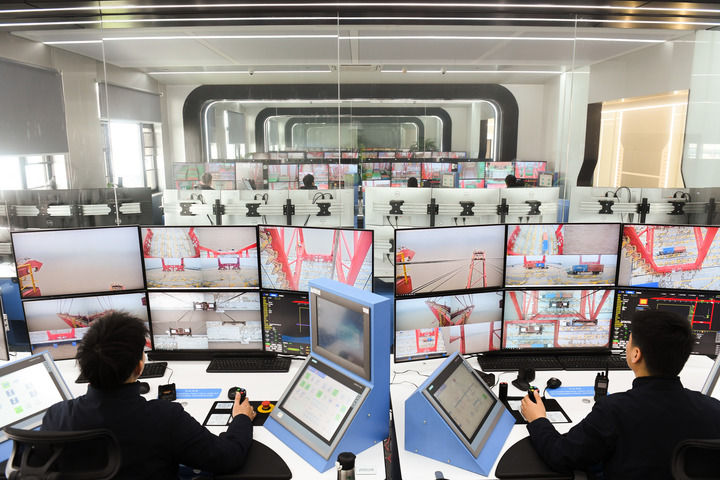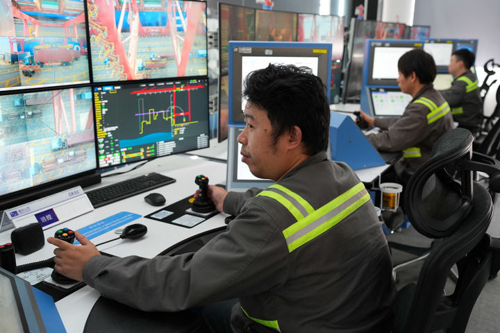 2024年4月2日,在宁波舟山港梅山港区远控桥吊操作中心,远控桥吊司机对现场船舶进行远程装卸作业。新华社记者 翁忻旸 摄