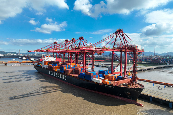 宁波舟山港开通首条中欧北极集装箱快航航线后相关货轮在港口装卸货物(2025年9月22日摄)。新华社发