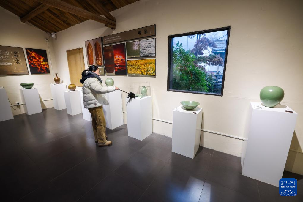 这是位于匡堰镇倡隆村楝树下艺术村落的东岙窑陶瓷艺术工作室展厅内展示的瓷器(12月24日摄)。
