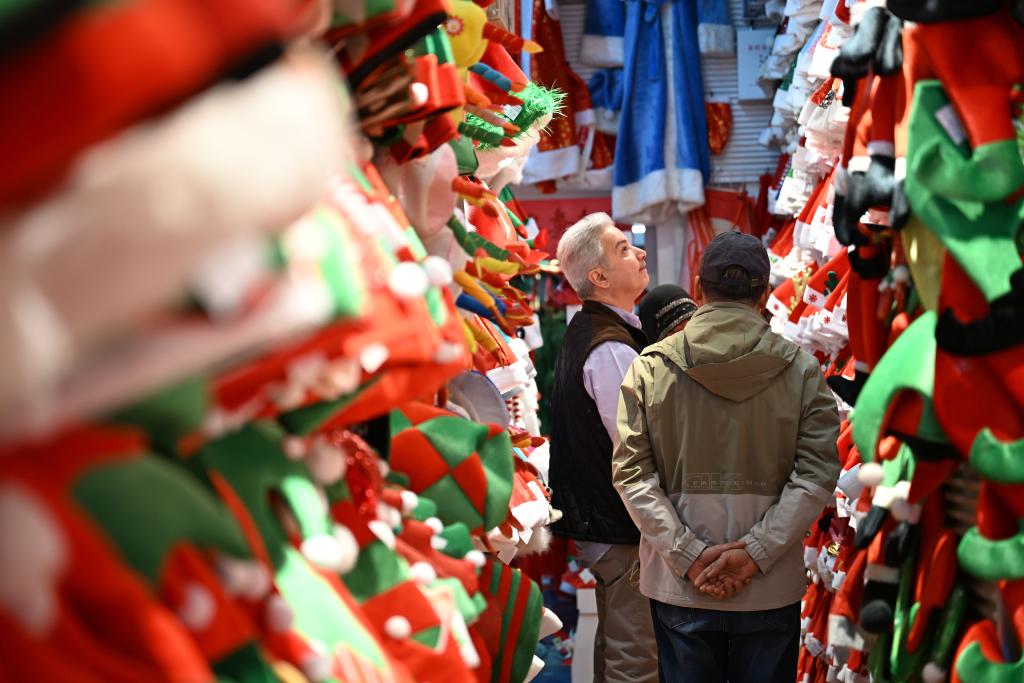 来自科威特的商人卡米勒·穆门走进店铺,在琳琅满目的圣诞帽里挑出5款,询问尺寸和价格后与蒋江平交换了联系方式,为后续合作留下可能。“在义乌基本可以满足所有的采购需求,商品品类齐全,商家服务热情,合作效率非常高。”穆门说。