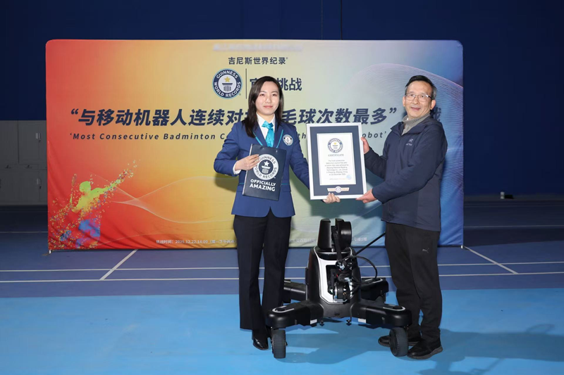 挑战现场堪称一场“人机巅峰对决”。面对前世锦赛羽毛球女单冠军卢兰和上虞第十四届运动会女单冠军朱思的来球,这款机器人反应迅捷——高速视觉追踪系统瞬间捕捉羽毛球轨迹,自主运动控制算法毫秒级完成路径规划,高动态移动系统带动机身灵活平移、急停转向,精准击球系统则稳稳挥拍,将每一颗来球精准回击至指定区域。一轮轮攻防下来,机器人始终保持稳定的对打节奏,最终以1452次的连续对打次数,创下新的吉尼斯世界纪录。