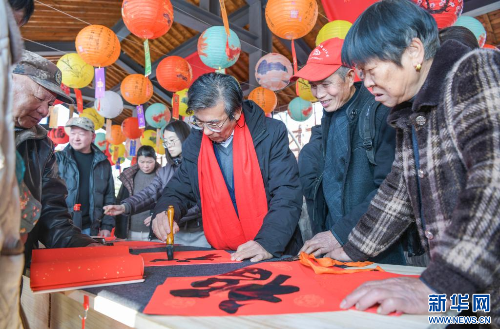 12月28日,书画爱好者在民俗游园会活动现场给人们写福字。