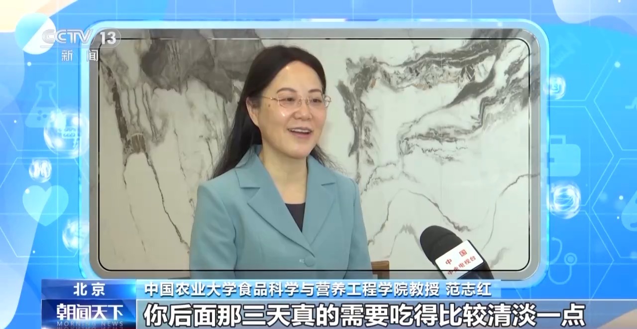 中国农业大学食品科学与营养工程学院教授 范志红:过节的时候哪些东西吃多了,比如肉吃多了,那这段时间就减点肉,蛋糕甜点吃多了,那这段时间先节制一下,改成清爽的水果蔬菜。