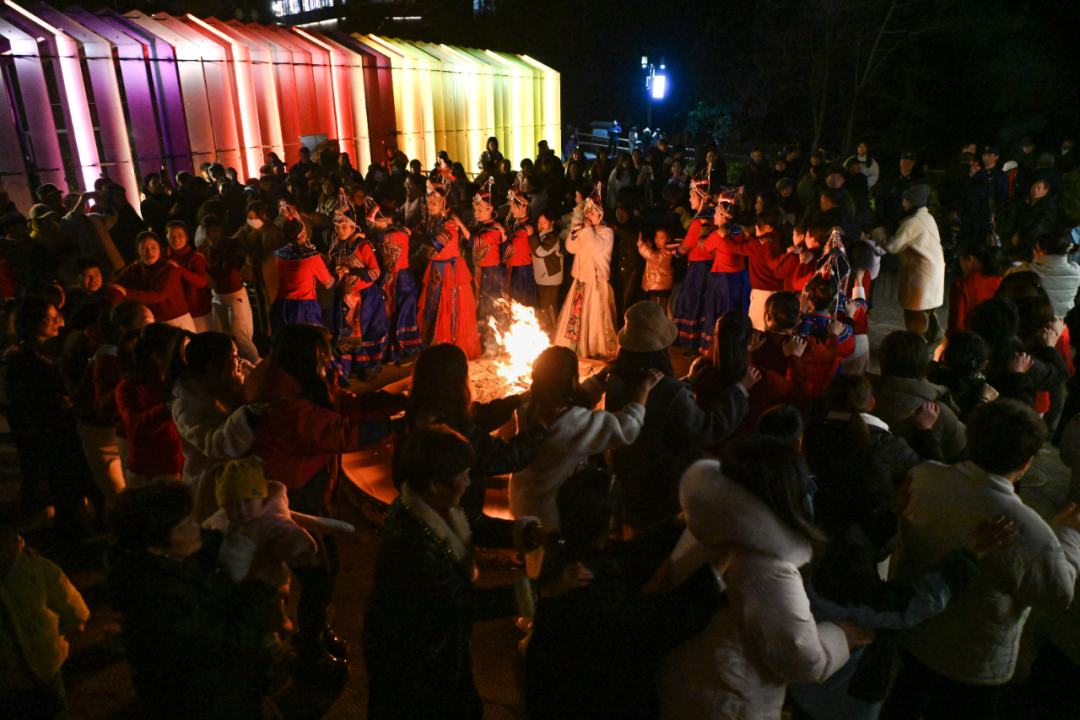 酒足饭饱后,夜幕轻垂,随即迎来精彩的“夜间狂欢”。畲茶广场上燃起熊熊篝火,橘红色的火光映照着一张张笑脸,游客们手拉手围炉起舞,畲族姑娘的裙摆随舞步飞扬,歌声与欢笑在夜色中回荡,沉浸式感受畲乡人的热情与豪迈。“这场夜游活动真是又有特色又热闹,畲乡人的热情太有感染力了!”游客王女士感慨道,这是她第一次体验畲族夜游,独特的风情给她留下了难以忘怀的美好回忆。