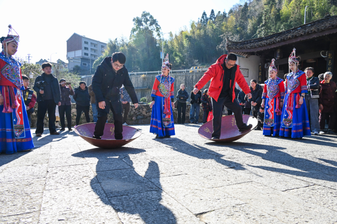 活动还特别设置NPC打卡集章环节,游客在村口、华服馆、市集等指定点位集齐印章,即可兑换超值优惠券,趣味互动让游玩乐趣再升级。游客钟先生难掩兴奋:“我参加摇锅比赛胜出后,赢得了当‘畲家新郎’的机会,亲身体验了畲家传统婚礼,实在太有趣了!”