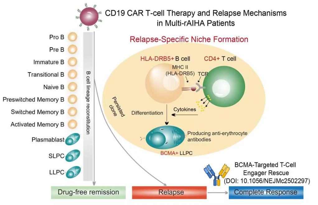针对多线治疗失败的难治/复发性AIHA患者,研究团队率先建立了细胞免疫治疗新体系,利用我国自主研发的自体CD19 CAR T细胞进行治疗,取得了显著疗效与良好的安全性,患者实现了长期无药物治疗缓解。对于少数CAR T治疗后复发的患者,研究团队进一步采用BCMA×CD3双特异性抗体进行精准二次挽救治疗,同样取得了成功。