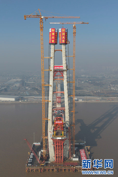 1月16日拍摄的杭州湾跨海铁路桥北航道桥8号主塔封顶施工现场(无人机照片)。