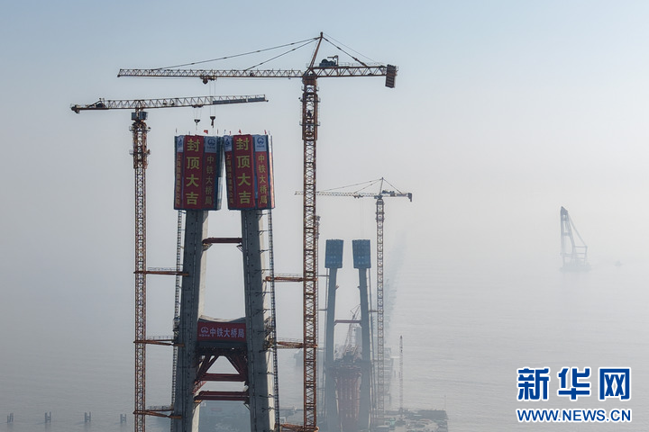 1月16日拍摄的杭州湾跨海铁路桥北航道桥,左侧为实现封顶的8号主塔(无人机照片)。
