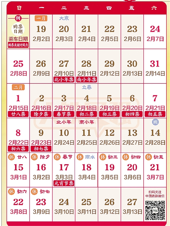 记者1月18日从中国国家铁路集团有限公司获悉,2026年铁路春运自2月2日开始,至3月13日结束,为期40天,全国铁路预计发送旅客5.39亿人次,节前客流高峰日预计为2月13日(腊月廿六),节后客流高峰日预计为2月23日(正月初七),春运首日火车票将于1月19日开始发售。