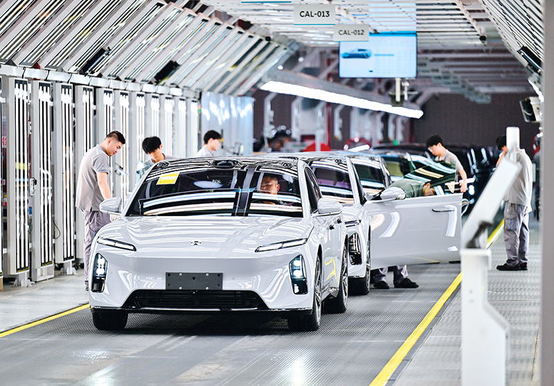 位于安徽省合肥市新桥智能电动汽车产业园蔚来第二工厂的新能源汽车生产线(2025年7月1日摄) 周牧摄 / 本刊