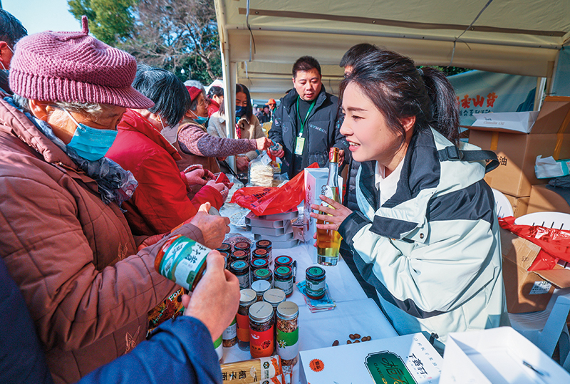 浙江省淳安县枫树岭镇下姜村党总支书记、村委会主任姜丽娟(右)介绍本村的特色农产(2024 年 1 月 6 日摄) 徐昱摄 / 本刊