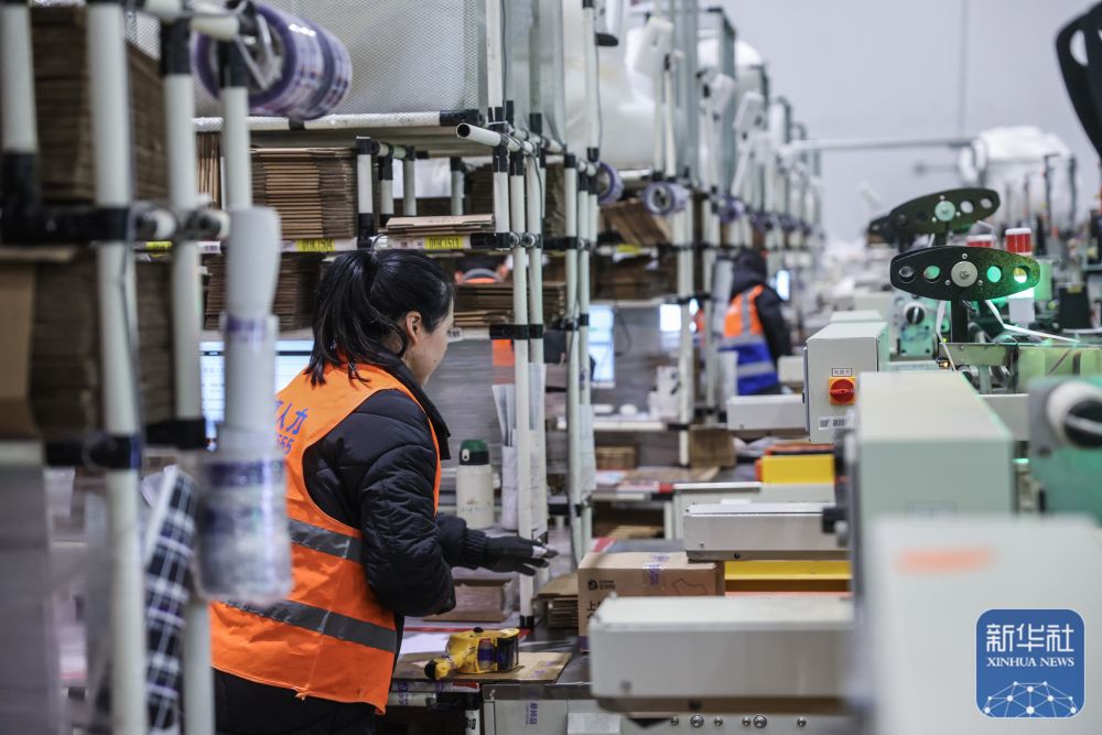 1月30日,义乌综保区跨境电商仓库的工人对完成海关申报的进口商品订单进行打包、张贴快递面单。