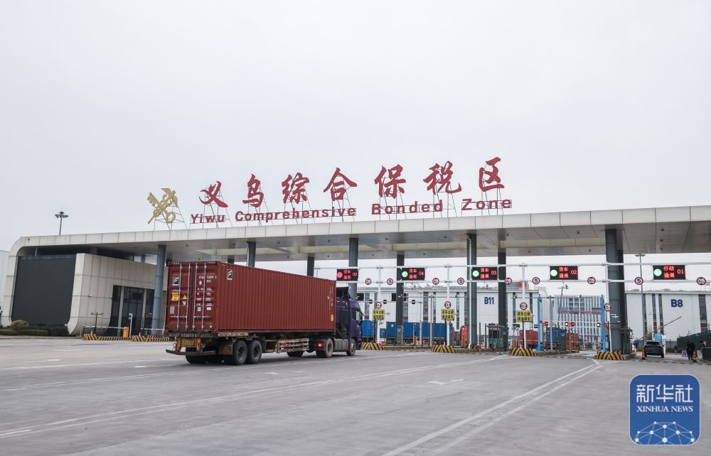 1月30日,一辆满载着进口商品的集装箱卡车进入义乌综合保税区进行保税仓储。