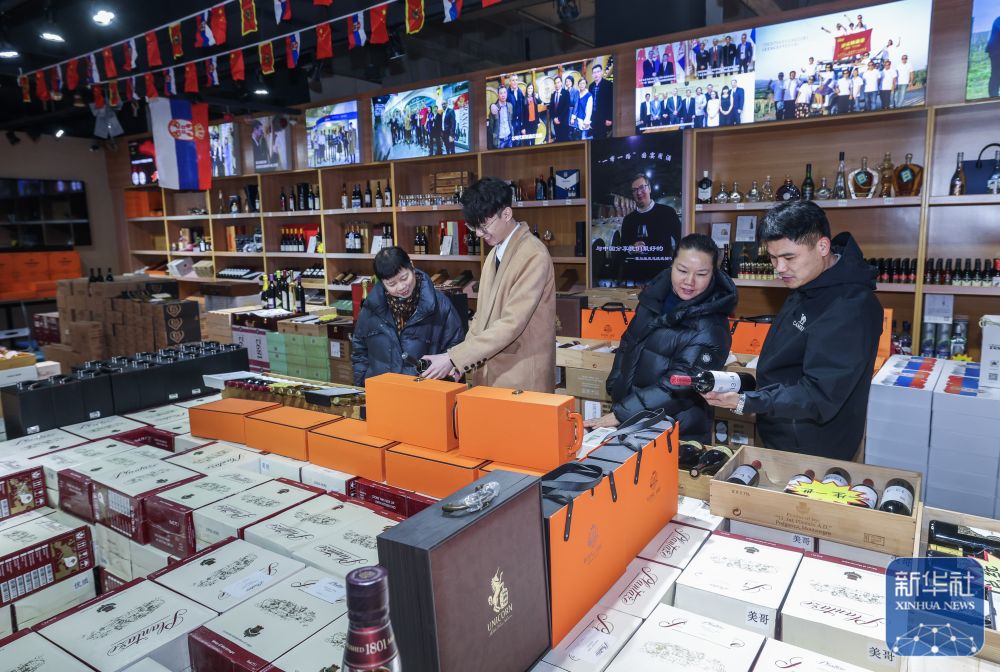 1月30日,在义乌中国进口商品城一家店铺内,店员给顾客推荐塞尔维亚葡萄酒。