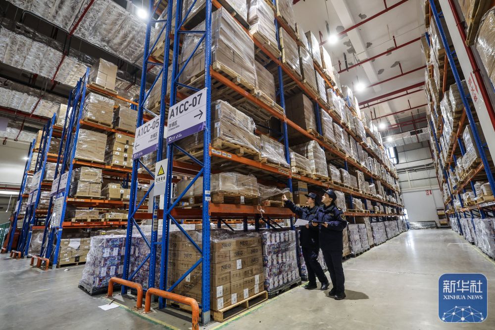 1月30日,义乌海关保税监管二科关员在义乌综保区跨境电商企业仓库巡库。