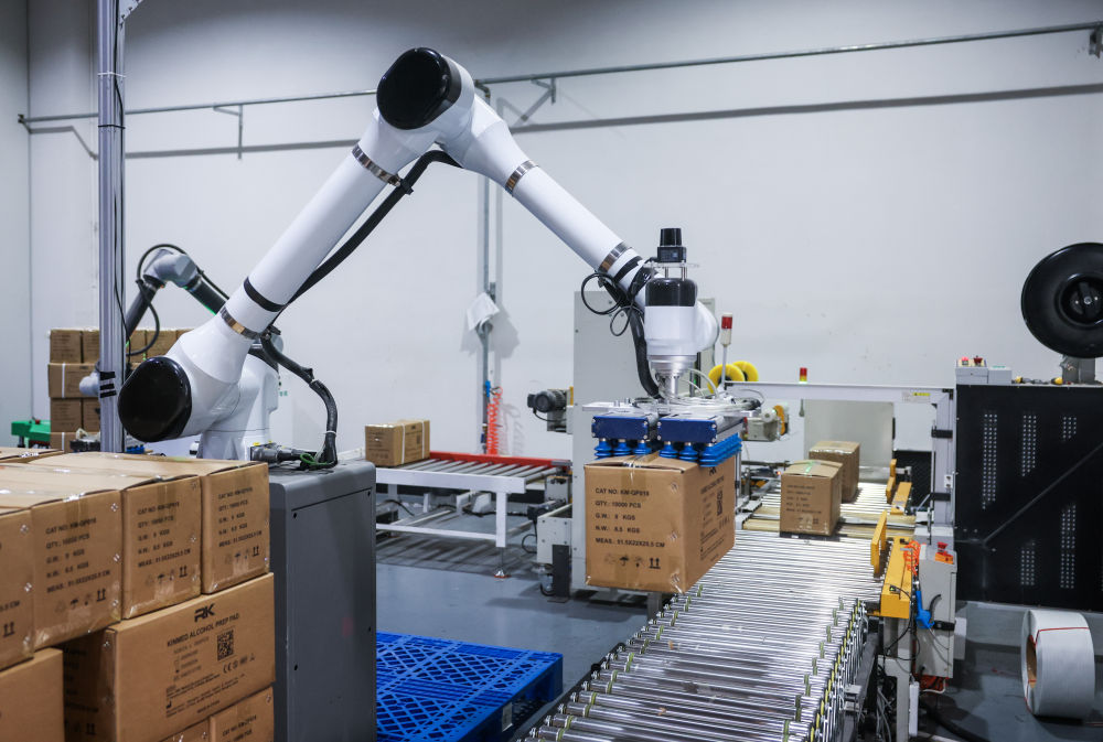 1月29日,在位于金华市金东区的景迪医疗用品有限公司车间内,自动化打包机器人在打包产品。该公司主要产品为医用敷料、耗材,防疫防控、消杀产品等,主要销往国内市场及欧美、中东等海外市场,是国家高新技术企业。