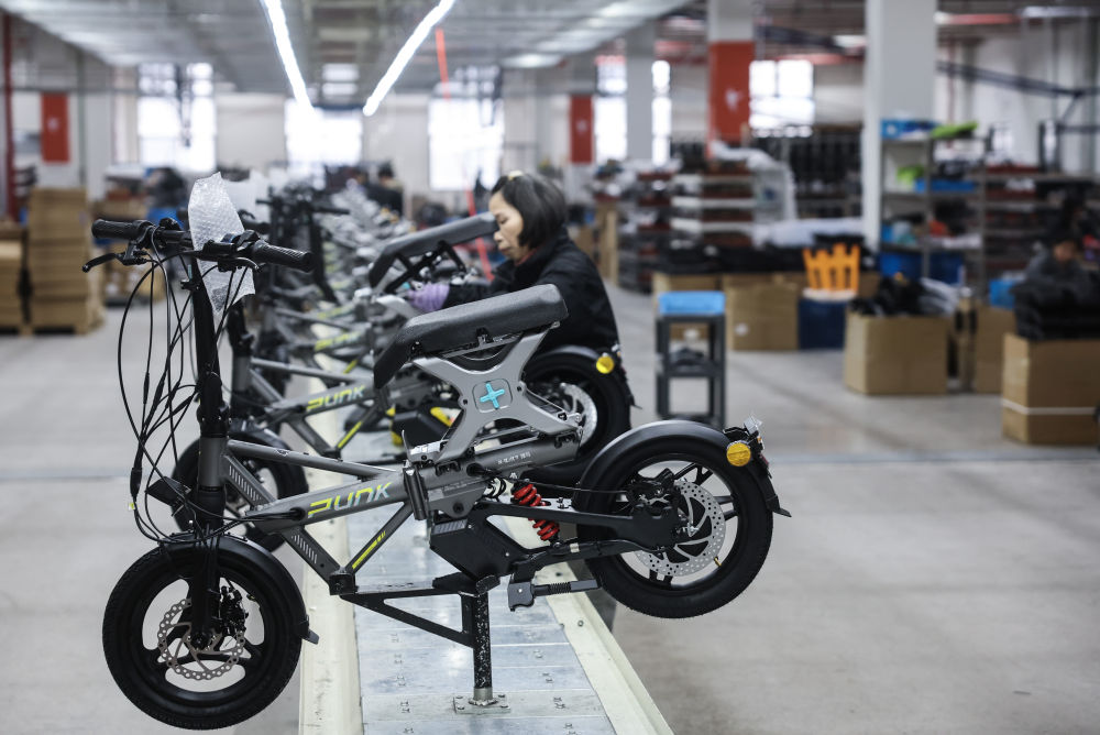 1月29日,在位于金华市金东区的浙江锋鸟车业有限公司组装车间内,工人在流水线上组装折叠电动自行车。该公司主要专注于出行细分领域智能短途代步工具的开发,集设计、研发、生产、销售于一体,其产品线涵盖超能折叠车、高性能电动自行车、家用轻电车,是国家高新技术企业和浙江省专精特新中小企业。