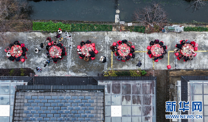 2月1日,当地百姓和游客在莲花镇戴家村品尝百家宴(无人机照片)。