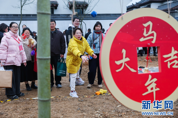 2月1日,游客在莲花镇年俗文化活动现场参加趣味游戏。
