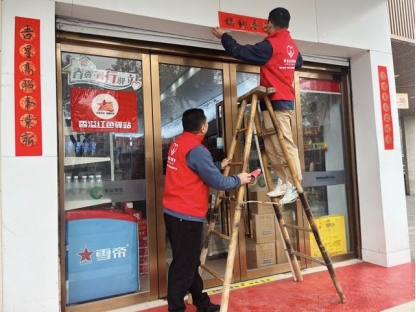 在城区老街的便民超市里,志愿者们将一幅幅寓意吉祥的春联和“福”字送到零售户手中。对于行动不便的老年零售户,志愿者们带上胶带、剪刀,踩着梯子将春联贴在店门两侧。