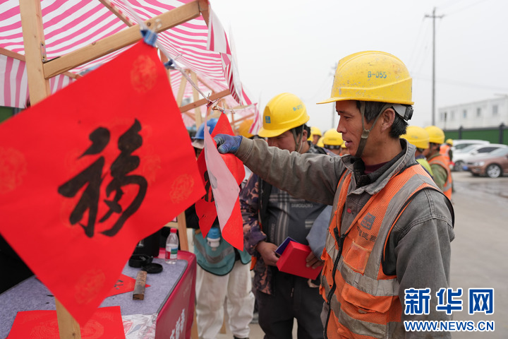 2月5日,建设者在挑选书法爱好者现场书写赠送的“福”字。