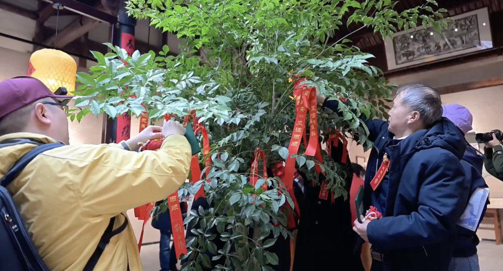 随后,宾客手持“迎春帖”步入梧桐祖殿,加盖“立春章”,并将祈福红绸系于树枝之上。