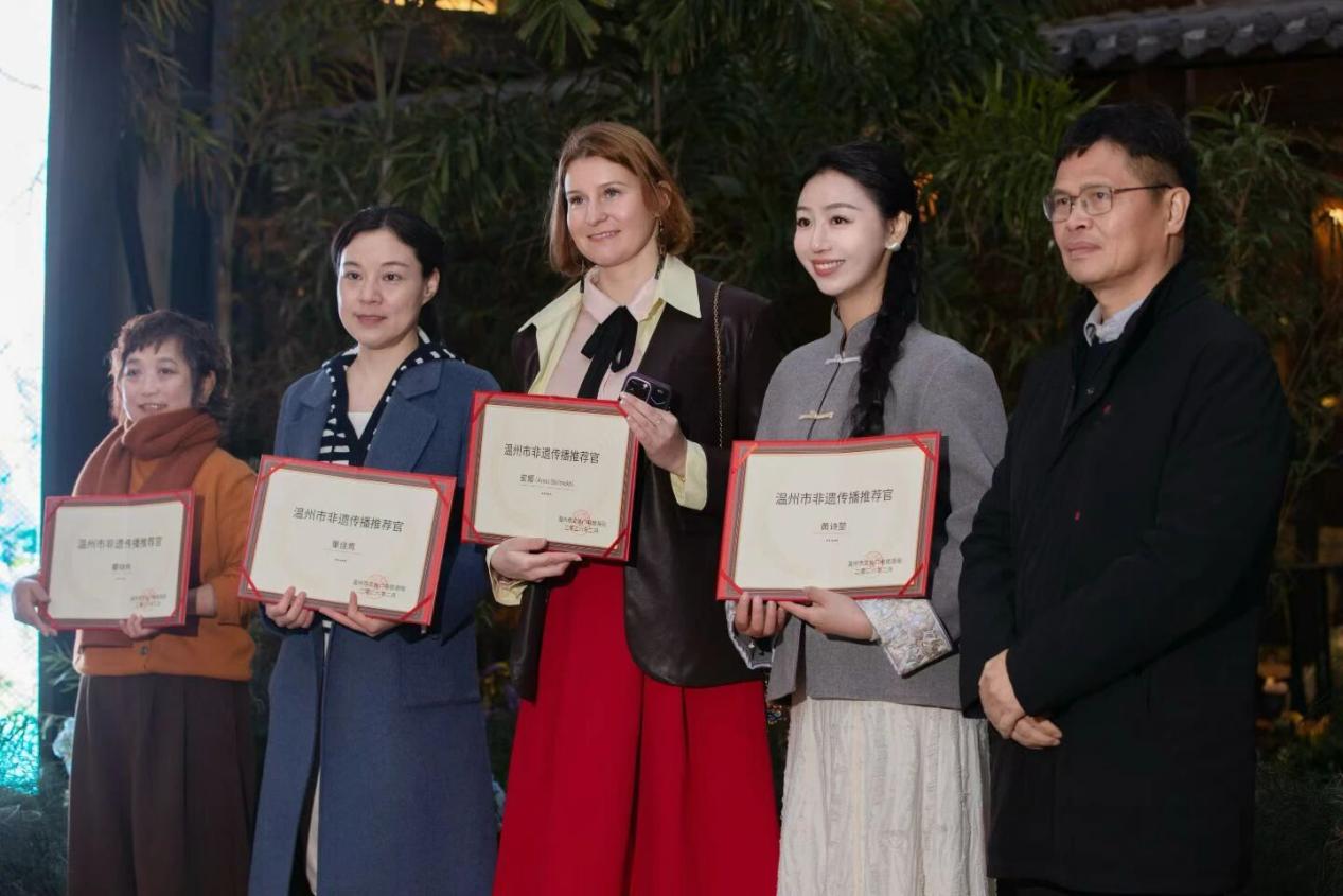 为进一步拓展传播渠道,现场还举行“温州市非遗传播推荐官”聘任仪式,董佳莺、瞿晓伟、俄罗斯籍非遗代言人安娜、非遗博主黄诗堃(思康)获聘。他们将运用短视频、直播、社群运营等新媒体手段,以年轻化表达推动温州非遗“破圈”传播。