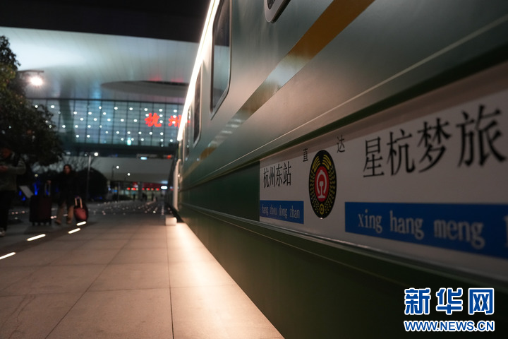 夜幕下的杭州东站东广场,四节复古绿皮车厢亮起暖黄色灯光,成为迎候夜间出行旅客落脚休息的一片“暖心港湾”。