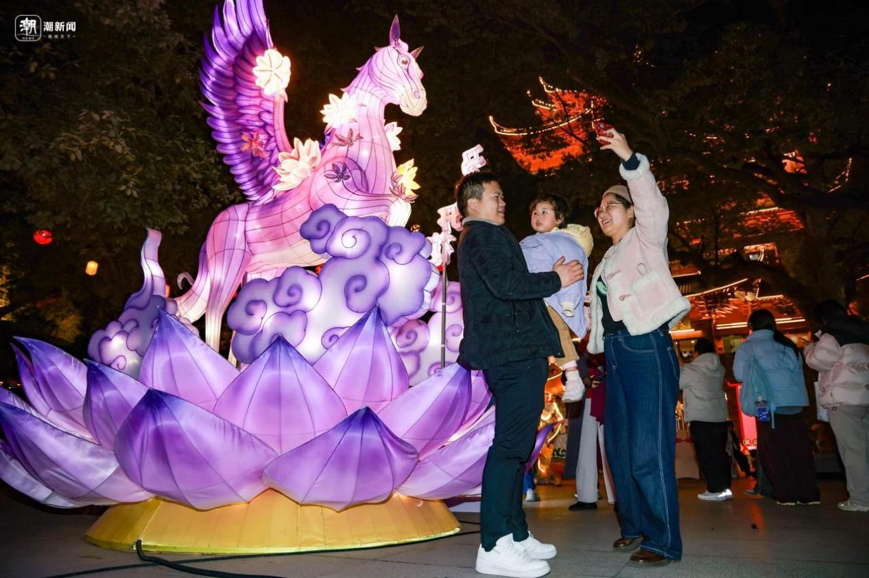 大观平台以麒麟花灯为主景,麒麟立于中式凉亭之内,呈现“踏云送福”的祥瑞意象。古树平台则主打繁复灯景:国潮胖马展现“春风得意马蹄疾”的古风神采;“一马当先”“马上有钱”等新春祝福,被巧妙融入打卡装置之中。