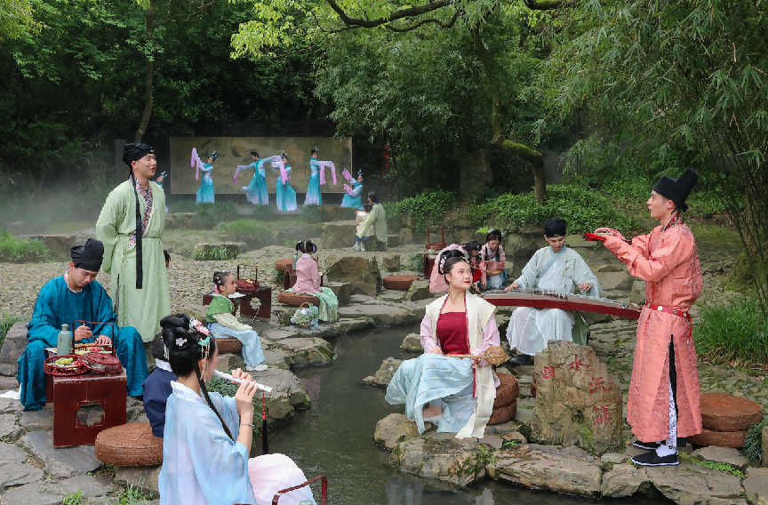 兰亭景区内,游客沉浸式体验“曲水流觞”。新华网发(绍兴文旅供图)