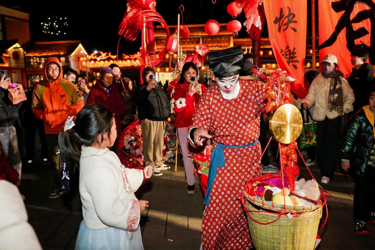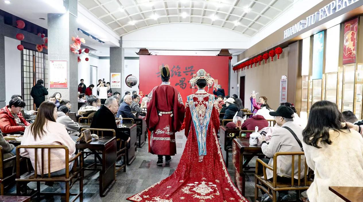 文化根脉赋能带来全新的沉浸式体验,让年味更有底蕴。中国黄酒博物馆内,“江南四大才子”(唐伯虎、祝枝山、文徵明、徐祯卿)扮演者开启新年第一坛佳酿,传统婚俗浪漫上演,新人巡馆撒糖,让游客沉浸在中式婚礼的浓厚氛围中。