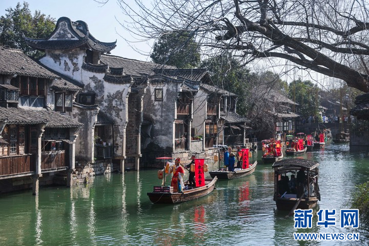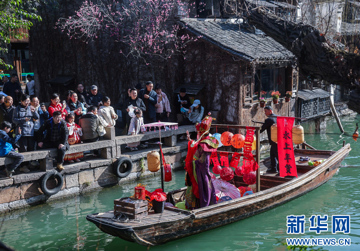 2月21日在乌镇景区内拍摄的福寿禧财水上巡游。
