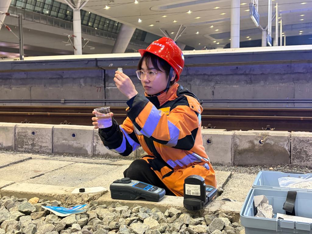 这头,给水工区工长金双喜手握一根听漏棒,逐一检查站台消防设备、股道给水设备和站台附近的水管,凭借多年经验,微小的“跑冒滴漏”都逃不过他的耳朵;那边,化验工胡敏蝶接了水样,现场就用便携仪器检测浑浊度、余氯、pH值等数据……