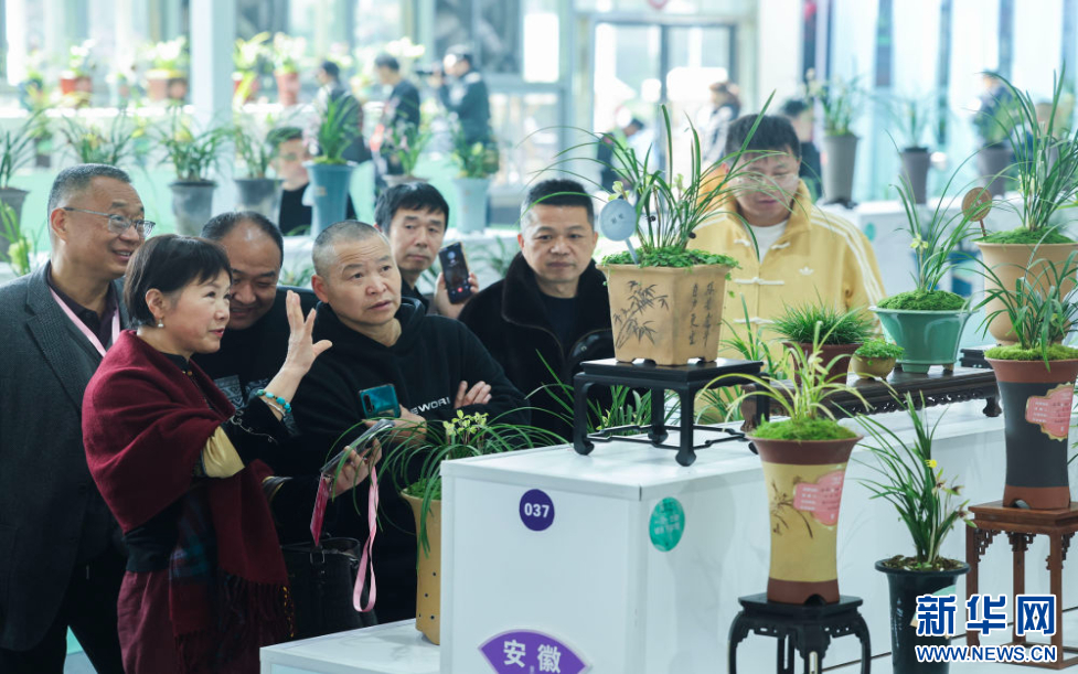 3月13日,观众在春兰大集现场观赏获得金奖的兰花。