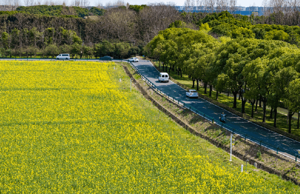 沿着三葛线行驶,豁然开朗处便是“田立方·临平未来农场”。千亩油菜花热烈绽放,金色田野如巨幅锦缎铺展,“四好农村路”如银色丝带穿梭其间,将花海分割成错落有致的几何图案。风吹过时,金浪翻滚,与远处碧空相接,美得让人忍不住停车驻足。