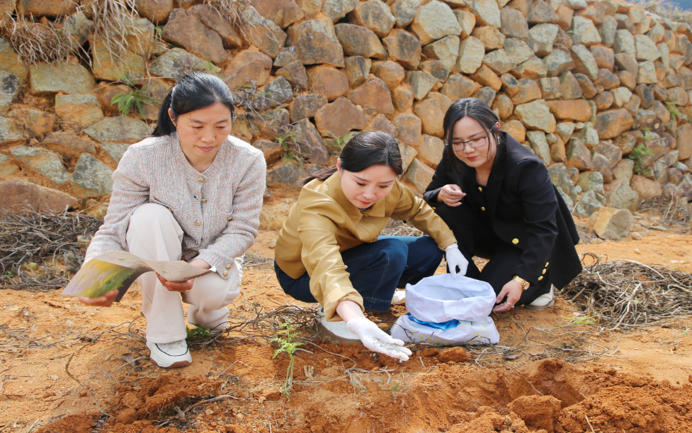 在蔡源乡双溪村小香薯繁育基地,基地负责人朱丽正跟着技术人员施肥。根据检测结果,该地块土壤偏酸性,种植户按照卡上建议利用石灰调理剂改善土壤环境,并搭配有机肥增加营养,为后续丰产打下坚实基础。