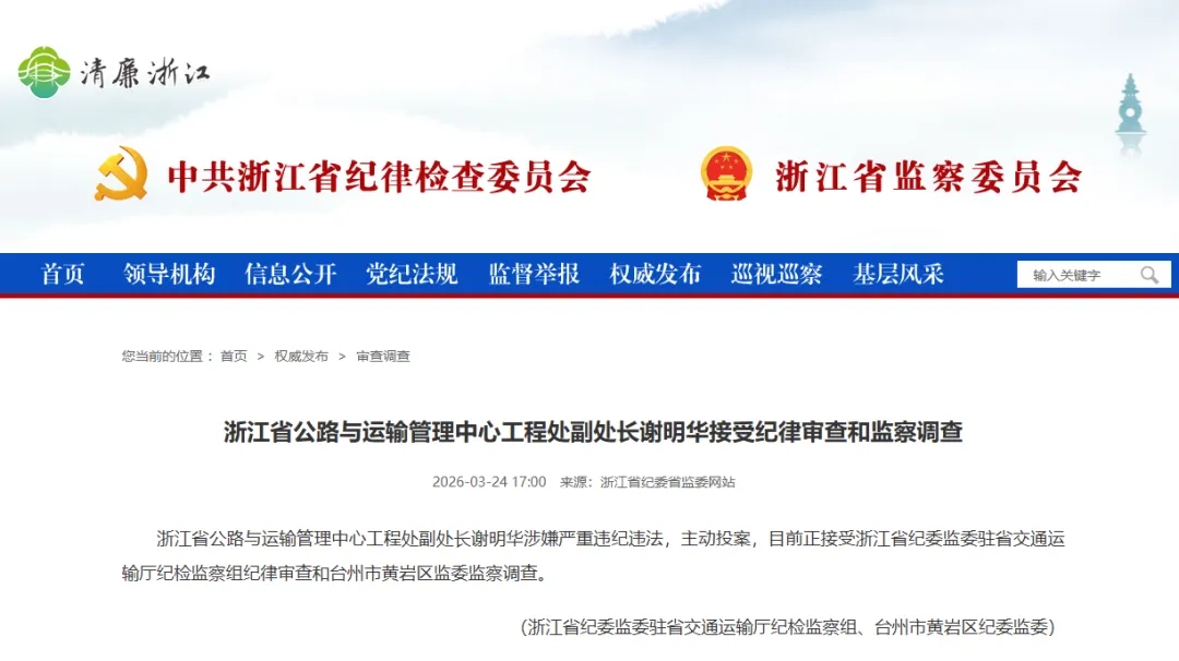 据浙江省纪委省监委网站24日消息,浙江省公路与运输管理中心工程处副处长谢明华涉嫌严重违纪违法,主动投案,目前正接受浙江省纪委监委驻省交通运输厅纪检监察组纪律审查和台州市黄岩区监委监察调查。