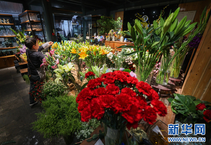 3月24日,月河历史文化街区的花店工作人员在整理花束。