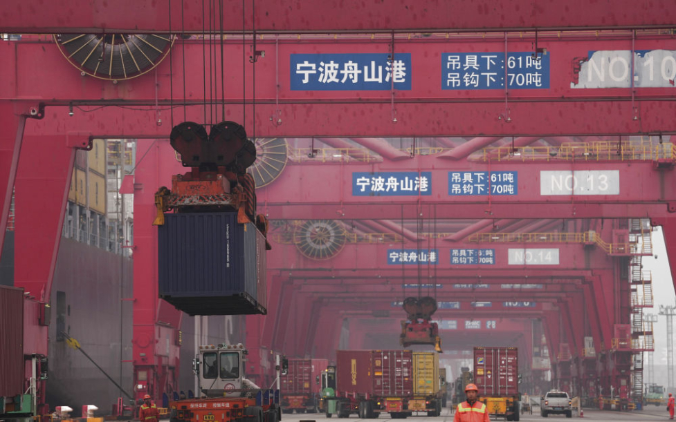 3月29日,卡车在宁波舟山港穿山港区集装箱码头装卸。