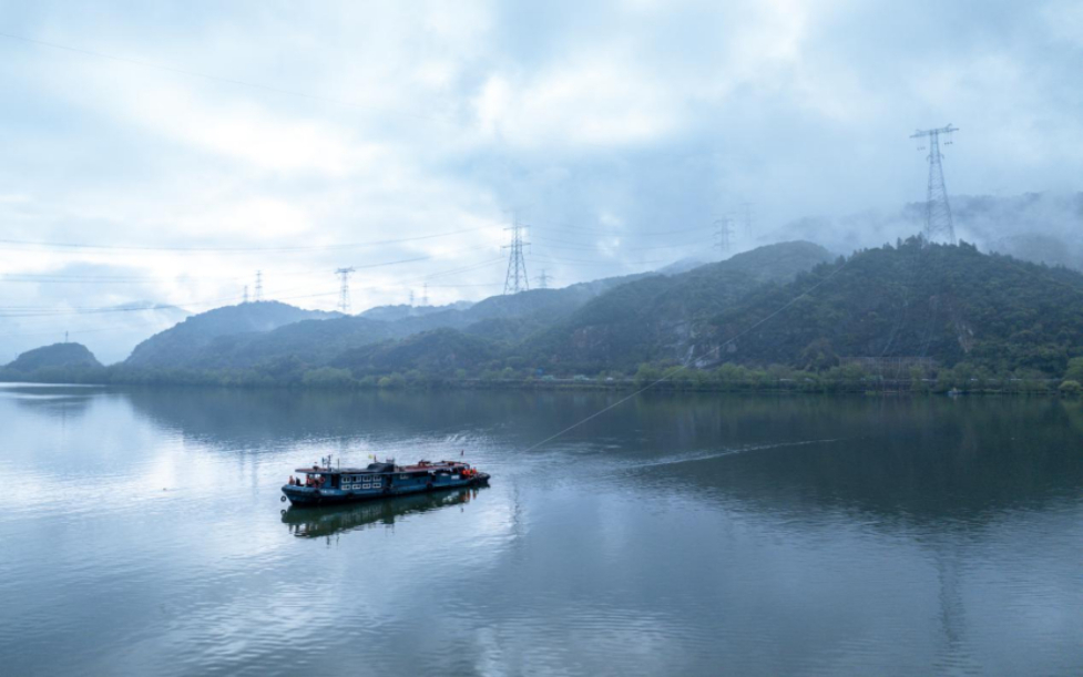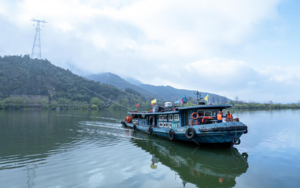 4月1日,在浙江杭州富春江西岸,一艘动力拖船拖着一根钢丝绳,缓缓驶向东岸的电力铁塔。这是“甘电入浙”特高压输电工程跨越富春江的作业现场,为明年建成投运奠定了基础。
