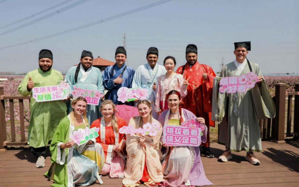 慈溪市水蜜桃产业园内,侨胞侨眷带着外国友人们换上了典雅汉服,衣袂翩然间穿梭桃林,沉浸式感受中国传统文化之美。桃林中,铿锵的鼓乐与灵动的舞狮轮番上演,一招一式间尽显东方气韵,引得大家纷纷举起手机拍照打卡,在欢声笑语中定格这满园春色与国潮交融的难忘瞬间。