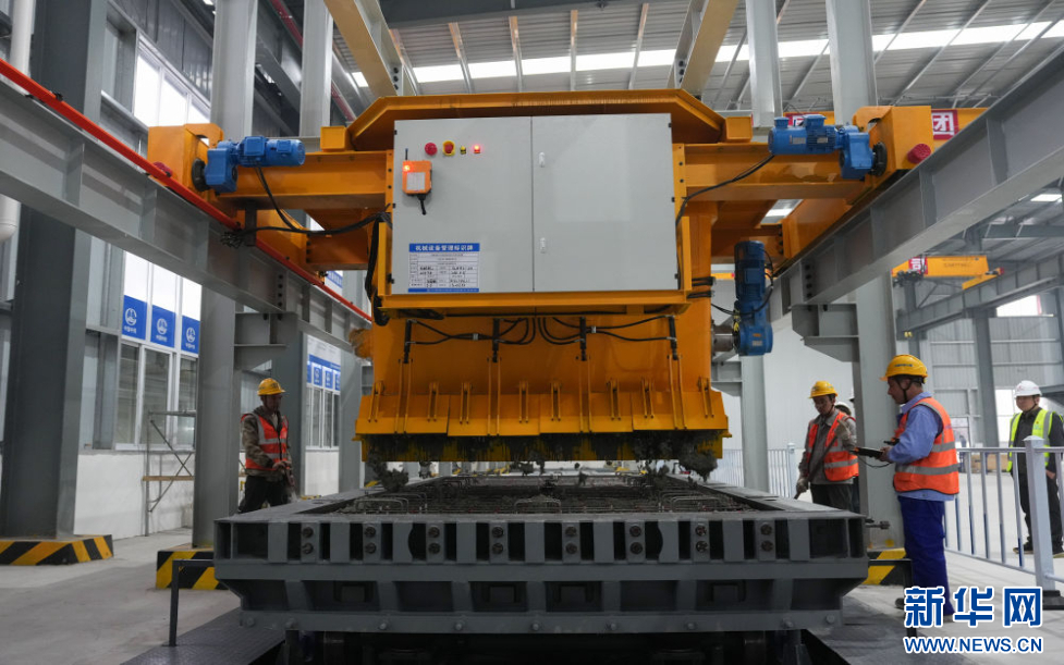 3月31日,技术人员在嘉善轨道板场操作自动化设备进行无砟轨道板的混凝土浇筑振捣作业。