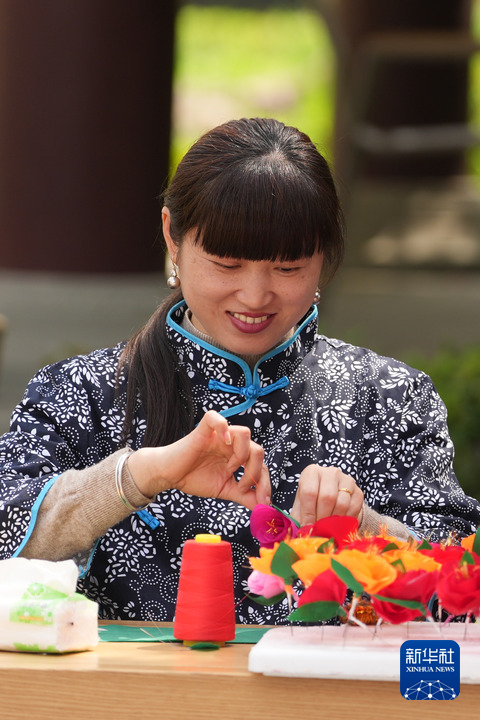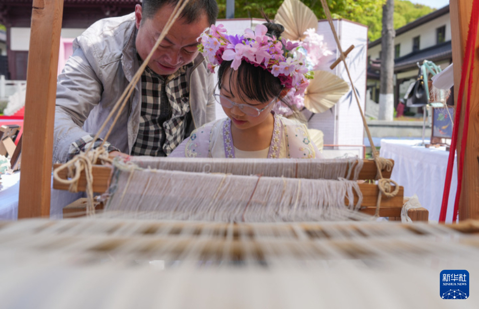 4月4日在湖州市南浔区善琏镇含山风景区拍摄的“轧蚕花”非遗课堂展示。