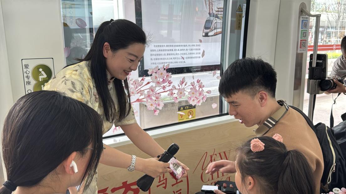 宣讲过程中,青年宣讲员们与乘客亲切互动。来自苏州的游客王先生带着女儿一起参加了活动,他这样感慨:“孩子第一次在电车上听汉服宣讲,既学了历史,又感受了传统文化,太有趣了。”