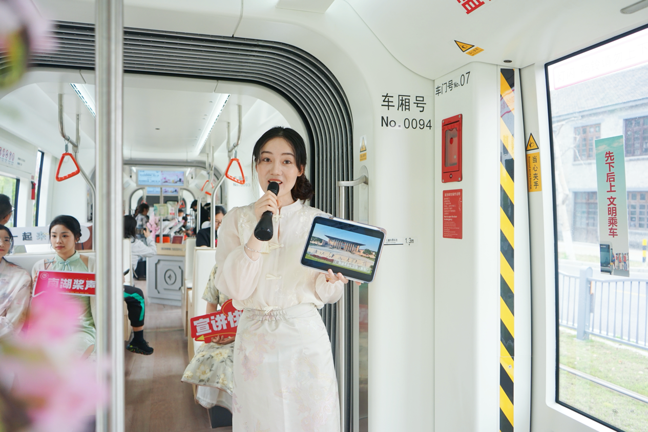 4月6日,“南湖桨声”群众性快闪宣讲活动在浙江嘉兴城市电车新中式茶饮专列上演。电车上,南湖区“南湖桨声”青年宣讲员们身穿新中式汉服,为市民游客及城市足球联赛外地球迷们,共同讲述“嘉兴何以醉江南”,带来一场沉浸式的红色文化与江南美学宣讲。
