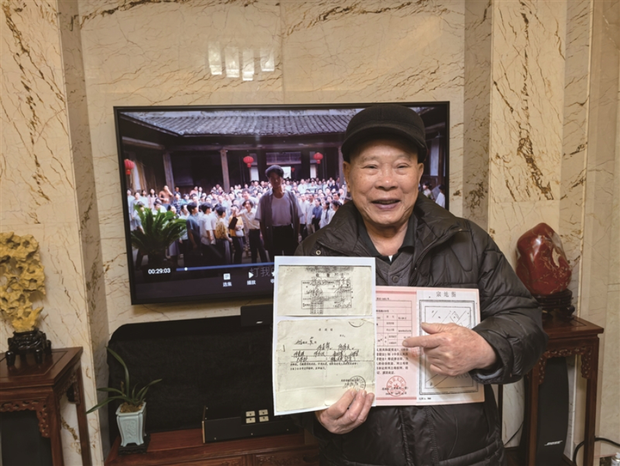 在《小城大事》农民们排队缴费的画面前,龙港市90岁的陈荣彩老人展示42年前购买地基的收据和准建证。受访者供图