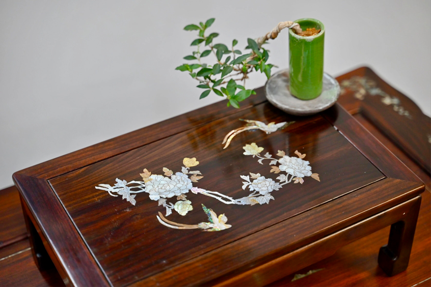作品以优质红木为胎,精选黄蝶贝、鲍鱼贝等深海珍贝为材,盘心主纹“凤凰戏牡丹”是中国传统吉祥纹样的经典组合。凤凰为百鸟之王,象征吉祥、太平与高贵;牡丹为花中之王,寓意富贵、繁荣与圆满。