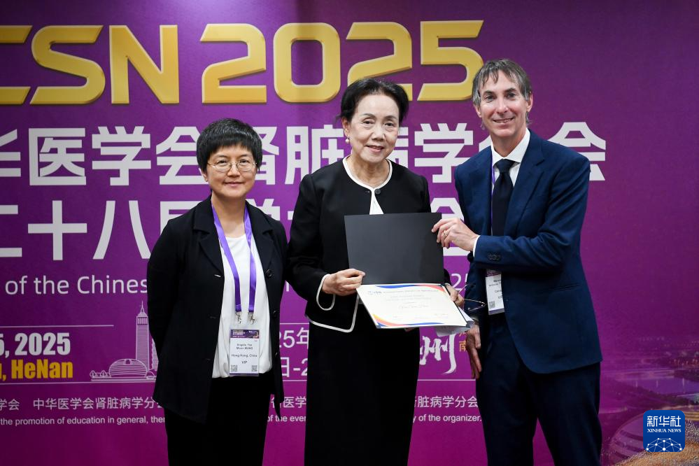 在河南郑州举行的中华医学会肾脏病学分会第二十八届学术年会相关活动上,中国科学院院士、南方医科大学南方医院肾内科主任侯凡凡(中)获颁2025年国际肾脏病学会先驱者奖(2025年10月23日摄)。新华社记者 吴鲁 摄