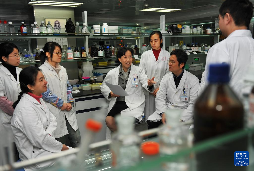 侯凡凡(中)和研究人员在实验室讨论课题(资料照片)。新华社发