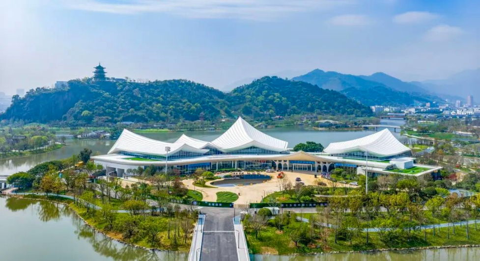 依托温州“环湖、环山、环岙”的独特地貌,打造了“一阁两馆十二景”。山巅的郭公阁既是景观制高点,更是温州文脉的守望者,用壁画与数字技术讲述东晋郭璞建城故事。金华园的婺派建筑透着儒风雅正,湖州园将竹海意境搬进城市,嘉兴园重现了水乡韵味。